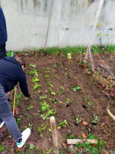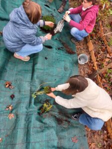 Léonie et une stagiaire de l’Atelier des Saisons sont venues lundi 17 novembre sur la pause méridienne. Le froid et l’humidité n’ont pas démotivé notre douzaine de jardiniers en herbe… ni leurs professeures.